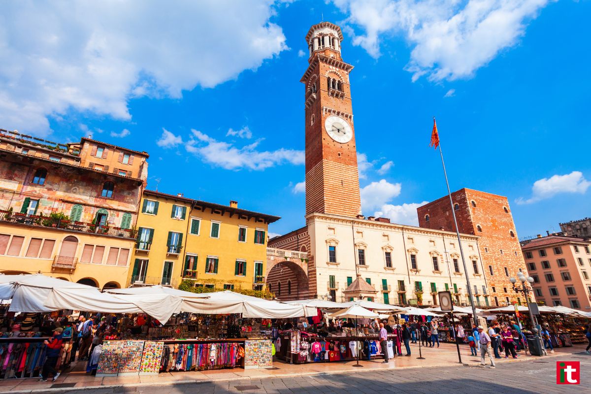 Mentre ti trovi nella vivace Piazza delle Erbe, alza lo sguardo: a dominare la scena con i suoi 84 metri di altezza è la magnifica Torre dei Lamberti, la torre civica più alta di Verona.